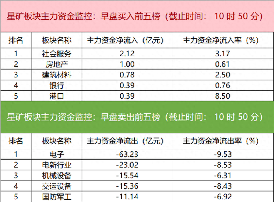 【主力资金监控:中芯国际净卖出超5亿元】财联社9月7日电,财联社星矿数据显示,今日早盘主力资金净流入社会服务、房地产、建筑材料等板块,净流出电子、电新行业、机械设备等板块,其中电子板块净流出超63亿元。个股方面,电科数字涨停,主力资金净买入1.42亿元,张江高科、江苏银行、星星科技获主力资金净流入居前;中芯国际遭净卖出超5亿元,立讯精密、北方华创、华力创通主力资金净流出额居前。
