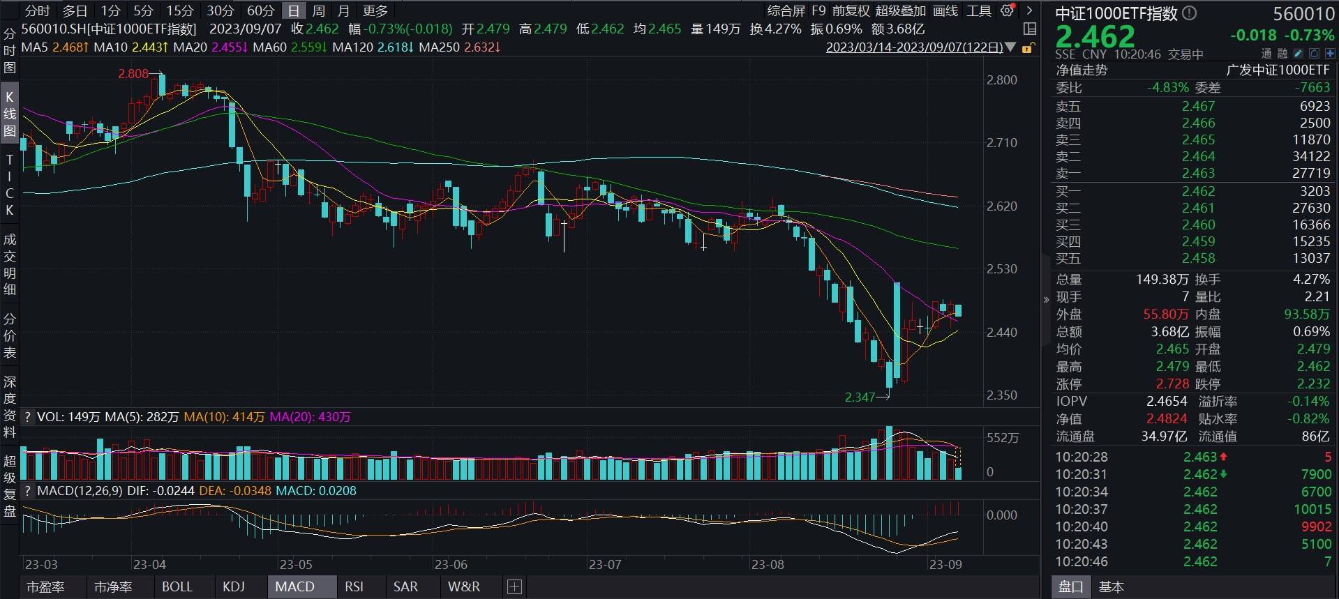 截至2023年9月7日10:20,中证1000ETF指数(560010)早盘震荡回调,现跌0.73%,最新报价2.462元,盘中成交额已达3.68亿元,换手率4.27%,资金持续关注,市场交投活跃。