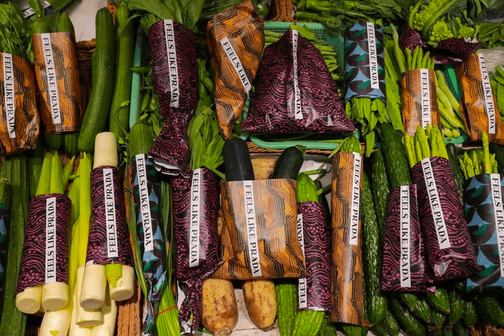Prada 选择的是上海的网红菜场,给蔬果包上的印花图案,其实就是秋冬季系列的服饰纹路花色。
