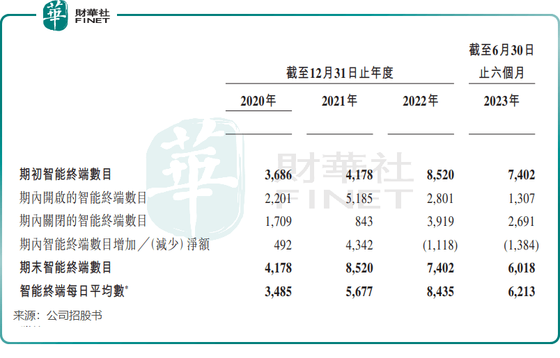 招股书显示,在2021年智能终端数量翻倍式增长后,2022年趣致集团开始大幅缩减智能终端规模,当年智能终端数量减少超过1100个至7402个。而在2023年上半年,趣致集团依然在大幅关闭智能终端,累计净减少1384个至6018个。