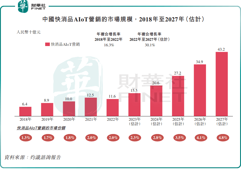 受益于快消品品牌对创新型且高性价比营销解决方案的强劲需求,以及AI、大数据、IoT等数智化技术的发展,根据灼识咨询报告,国内快消品AIoT营销市场规模在2018年至2022年的年复合增长率为16.3%,预计2022年至2027年年复合增长率达30.1%。