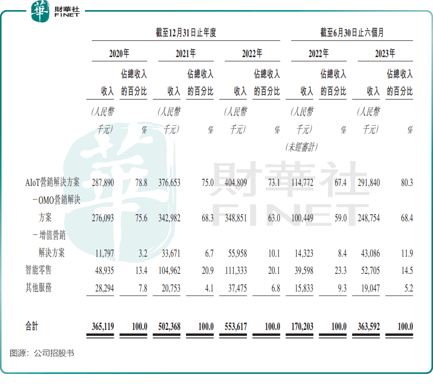 得益于大客户数目整体保持稳定以及每名大客户平均收入逐年上升,AIoT营销解决方案收入增长迅猛,由2020年的2.88亿元大幅增长至2022年的4.05亿元,并由2022年上半年的1.15亿元增至2023年上半年的2.92亿元。此外,智能零售业务收入也保持逐年增长,该业务2022年收入比重为20.1%。