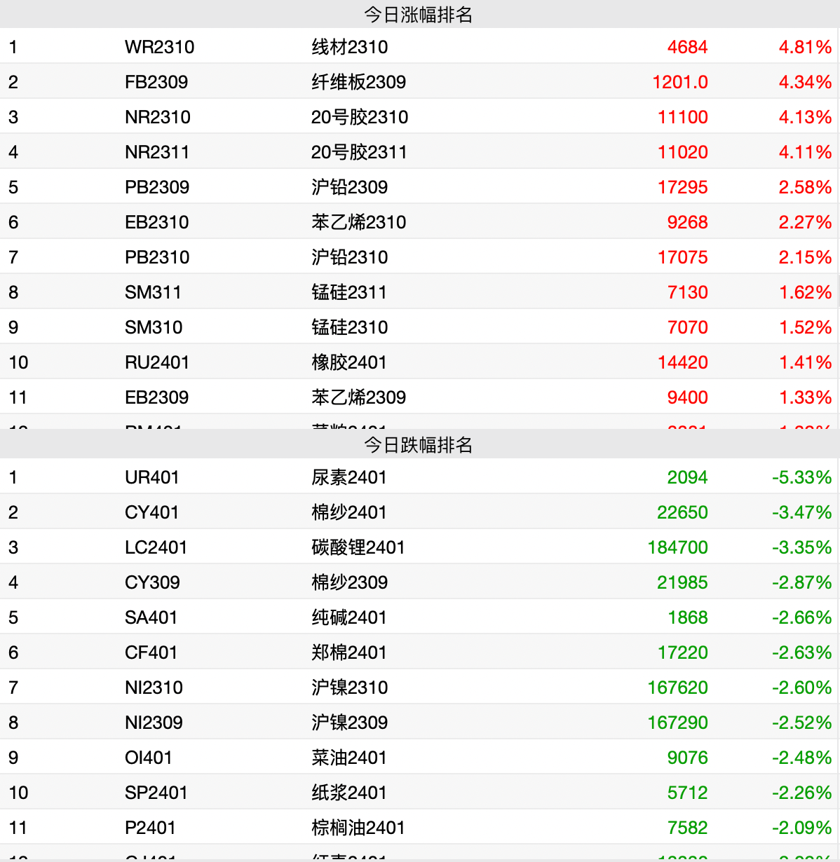 9月7日消息,商品期货收盘多数下跌,尿素跌超5%,棉纱、碳酸锂跌超3%,纯碱、棉花、沪镍、纸浆、红枣跌逾2%;沪铅涨逾2%,锰硅、橡胶、菜粕涨逾1%。