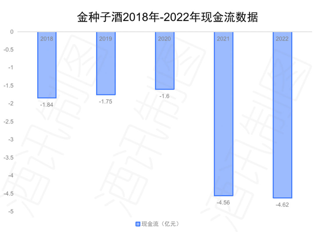 屋漏偏逢连夜雨,作为衡量企业财务状况和经营能力重要指标之一,金种子酒现金流亏损面正不断扩大。酒讯梳理发现,金种子酒现金流从此前约1亿元亏损逐渐扩大至近5亿亏损。数据显示,2018年至2022年金种子酒现金流分别为-1.84亿元、-1.75亿元、-1.6亿元、-4.56亿元、-4.62亿元。