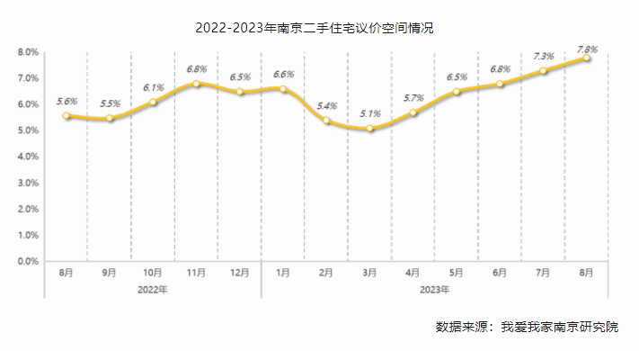 针对许多买房人担心的市场回暖后二手房价格回升的情况,记者从我爱我家南京研究院了解到,南京二手房的议价空间不仅没缩水,反而还扩大了,8月份的议价空间为7.8%,环比增加0.5%再创新高。中介从业人员透露,自3月份以来,议价空间已经出现了五连涨,这与市场行情走势趋同,卖家为了促进成交变现,只有在价格上让利。而利好新政则出现在8月末尾,对于整个8月份的行情并无助益,因此,“金九”是一个值得观察的重要窗口,如果市场销量持续回升、议价空间缩水、挂牌量价齐涨,则让人对于“银十”更加期待。