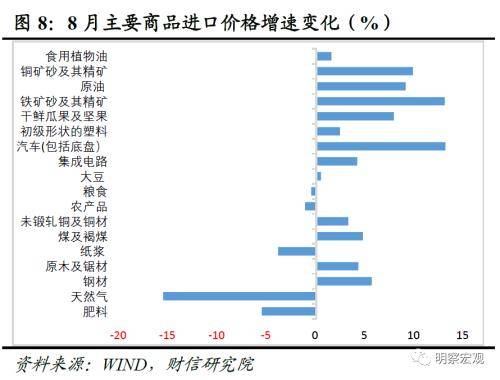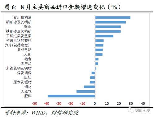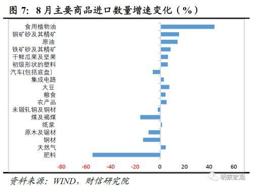 二、低基数、内需恢复、价格上涨共同支撑进口增速降幅收窄。去年8月份进口增速由正转负,低基数是进口增速回升的原因之一。从进口量和价看,主要商品进口价格和数量增速多数环比提高,量价齐升共同支撑本月进口增速降幅收窄;本月进口数量环比提高品种明显增多,由绿色智能化转型领域扩散至基建相关商品,表明受益于政策加力显效,国内需求恢复对进口需求的支撑作用明显。