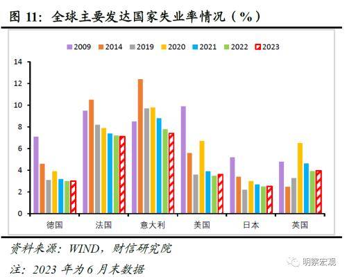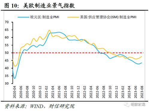 一是预计外需放缓将主导出口数量走势,但全球增长仍有较强韧性,出口数量下行斜率或偏缓。其一,8月份摩根大通全球综合PMI、全球制造业PMI指数录得50.6%、49%,分别较7月份回落1.0和提高0.4个百分点,前者连续7个月高于临界值,后者则连续12个月处于收缩区间,这意味着全球制造业需求放缓迹象明显(见图9)。分地区看,8月份美国、欧元区制造业PMI指数分别录得47.6%、43.5%,较上月提高1.2和0.8个百分点,连续10个月和14个月位于收缩区间(见图10),说明发达经济体经济下行压力较大。预计受货币累积紧缩效应显现、地缘政治关系紧张、高利率环境加剧金融风险等因素影响,未来美欧等主要经济体PMI仍存进一步下行压力,我国出口数量增速大概率随之回落;其二,受美欧劳动力市场供应偏紧对居民收入形成支撑影响(见图11),美欧经济衰退预期持续降温,市场也不断上调2023年美欧经济增长预期,预计2023年全球经济增长仍有较强韧性,短期内出口数量增速下行幅度和速度或均相对可控。
