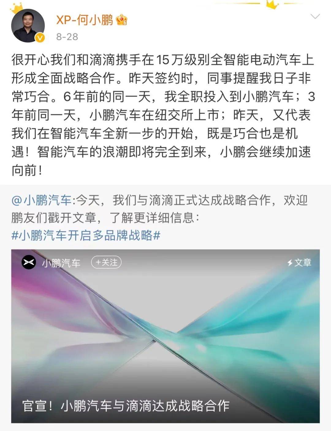 仅仅一个月的时间,小鹏先后牵手大众以及滴滴,朋友圈快速扩大。