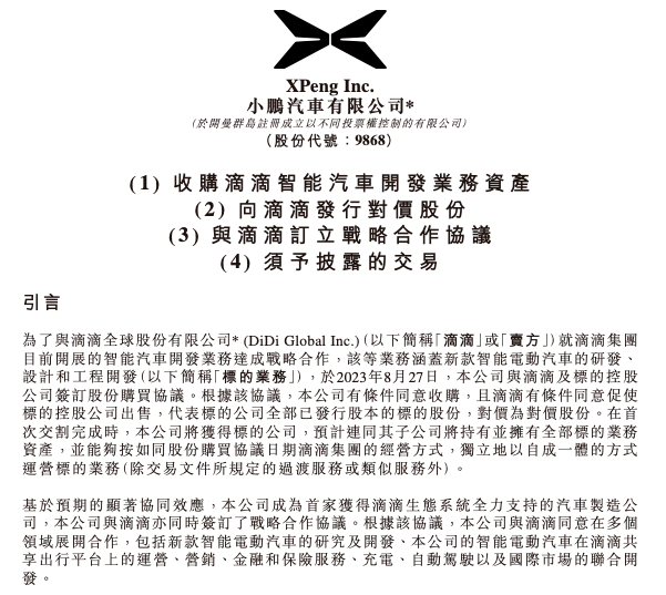 根据小鹏汽车公告,将发行占交易完成后总股本3.25%的A类普通股,收购滴滴旗下智能电动汽车项目相关资产和研发能力。据悉,此次收购的最高总对价约为58.35亿港元(约合人民币54.18亿元)。