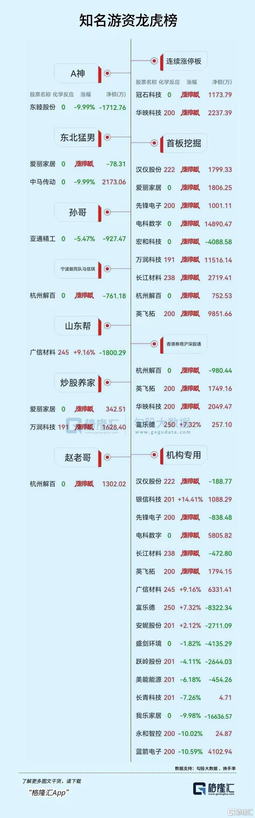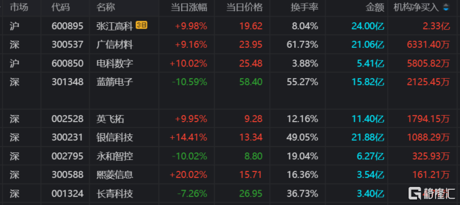龙虎榜中涉及机构专用席位的个股中,当日净买入额前三为广信材料、电科数字、蓝箭电子,分别为6331.40万元、5805.82万元、2125.45万元。