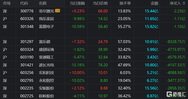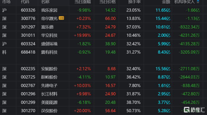 龙虎榜中涉及机构专用席位的个股中,当日净卖出额前三为我乐家居、富乐德、华立科技,分别为1.66亿元、8322.34万元、4231.26万元。