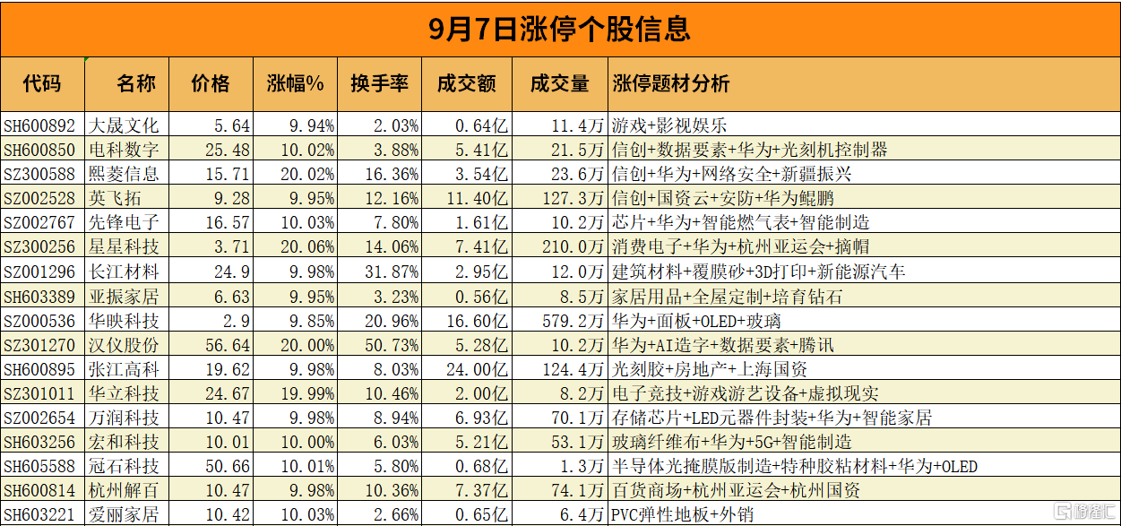 个股方面,华为产业链的华映科技6天5板、冠石科技2板、熙菱信息创业板首板、星星科技创业板首板,杭州本地+零售的杭州解百5天3板,芯片产业链的张江高科2板,家居装饰板块的亚振家居4天2板、爱丽家居4天2板。