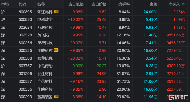 今日龙虎榜净买入额榜前三为电科数字、万润科技、英飞拓分别为1.49亿元、1.15亿元、9851.66万元。