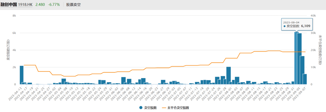 从交易数据上看,9月4日至9月7日,融创的卖空占比分别为12.99%、32.1%、11.89%、2.93%、1.04%,卖空占比大幅下跌。