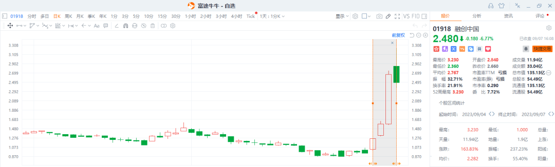 8月,融创的市值最低跌至40亿左右时,借券做空融创的成本一度高达年化55%,并且还很难借到,空头十分拥挤,所以当空头回补时,这一轮的上涨特别快。