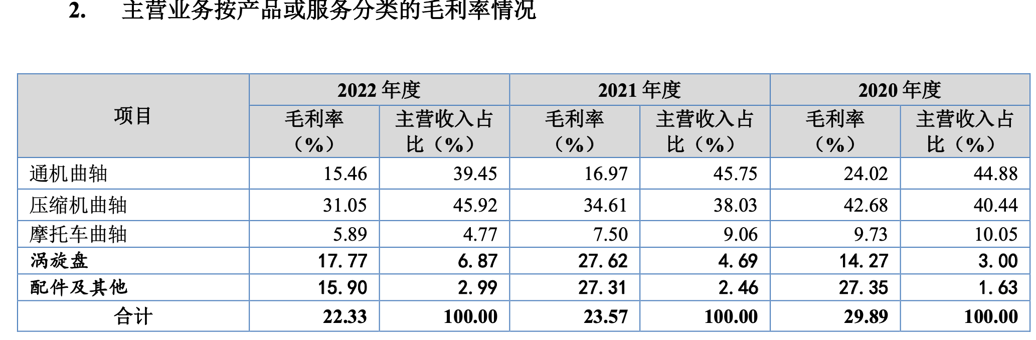分产品来看,美心翼申几乎所有产品线的毛利率均呈下滑趋势。2020年-2022年,公司通机曲轴的毛利率分别为24.02%、16.97%、15.46%;压缩机曲轴毛利率42.68%、34.61%、31.05%;摩托车曲轴毛利率9.73%、7.50%、5.89%;涡旋盘毛利率14.27%、27.62%、17.77%;配件及其他毛利率27.35%、27.31%和15.90%。