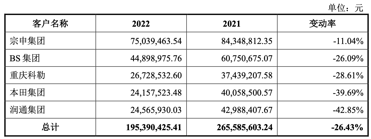 虽然对爱默生集团的销售额在上涨,但2022年对其余重要客户的收入却在下滑,比如对宗申集团的销售额同比2021年减少11.04%,对BS集团的销售额同比减少26.09%,对润通集团的销售额更是同比骤减42.85%。