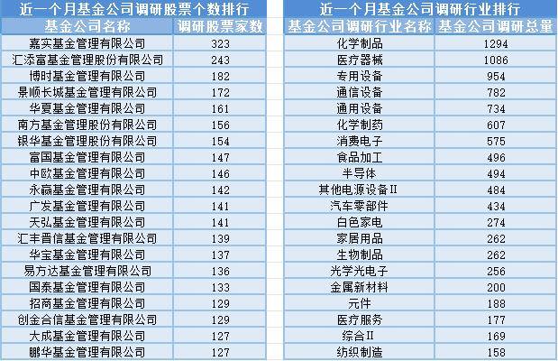 近一个月(8月7日-9月7日),嘉实基金参与公司调研的数量最多,共调研323家上市公司,然后调研较为活跃的还有汇添富基金、博时基金、景顺长城基金,分别调研243家、182家、172家上市公司;从调研行业上来看,基金公司对化学制品行业的上市公司调研次数最多,共有1294次,其次是医疗器械行业,基金公司调研了1086次。
