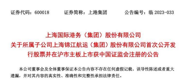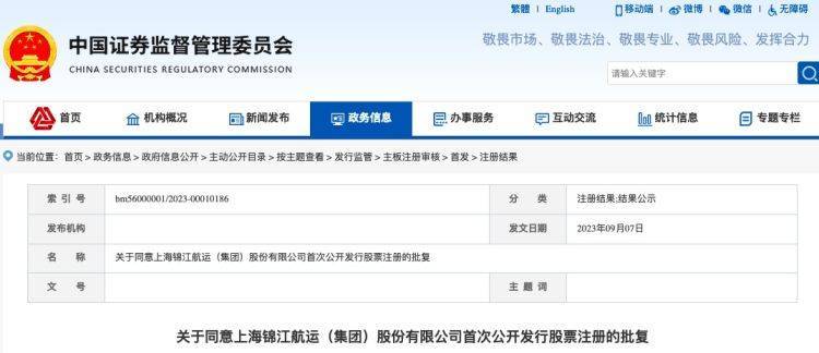公告称,根据中国证监会2023年9月7日发布的《关于同意上海锦江航运(集团)股份有限公司首次公开发行股票注册的批复》,证监会同意锦江航运首次公开发行股票的注册申请。锦江航运将会根据中国证监会及上交所的相关规定及要求开展后续工作。
