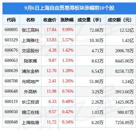 9月6日上海自由贸易港板块较上一交易日上涨0.15%,张江高科领涨。当日上证指数报收于3158.08,上涨0.12%。深证成指报收于10515.21,下跌0.24%。上海自由贸易港板块个股涨跌见下表: