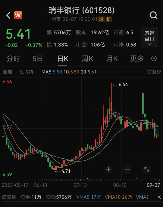 截至9月7日收盘,瑞丰银行每股报5.41元,7月以来股价涨幅超11%。最新市值为106亿元。