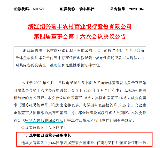 根据瑞丰银行同日发布的公告,9月7日,该行第四届董事会第十六次会议以现场和视频相结合的方式召开,会议审议通过选举吴智晖为银行第四届董事会董事长,任期与第四届董事会任期一致。
