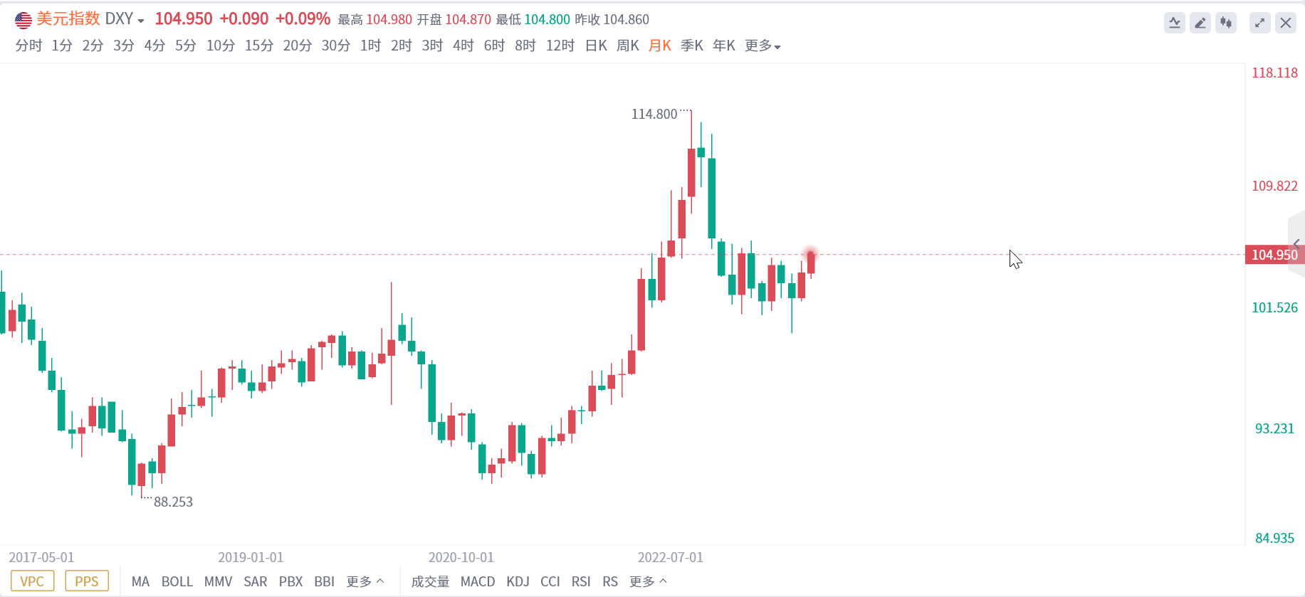 虽然美元指数现在接近六个月高位,但较去年同期水平仍下跌近5%,较去年达到的20多来高位(接近115)下跌8.6%。