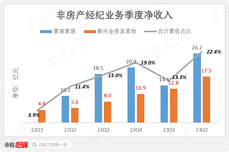 2023年上半年,家装家居、新兴业务及其他的净收入分别为40亿元和30亿元,合计营收占比首次超过20%。