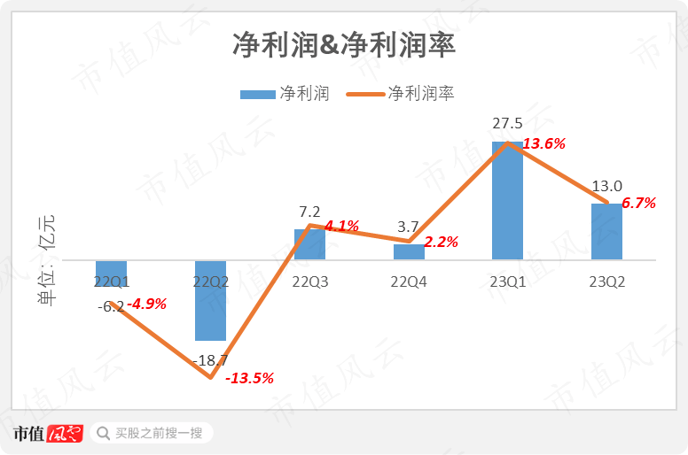 2023年二季度,公司净利润13亿元,而去年同期为-19亿元;上半年,净利润40亿元,去年同期为-25亿元。