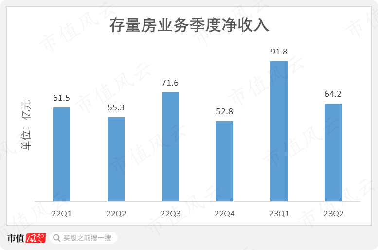 2023年二季度,存量房业务净收入为64亿元,同比增长16%;上半年净收入156亿元,同比增34%。