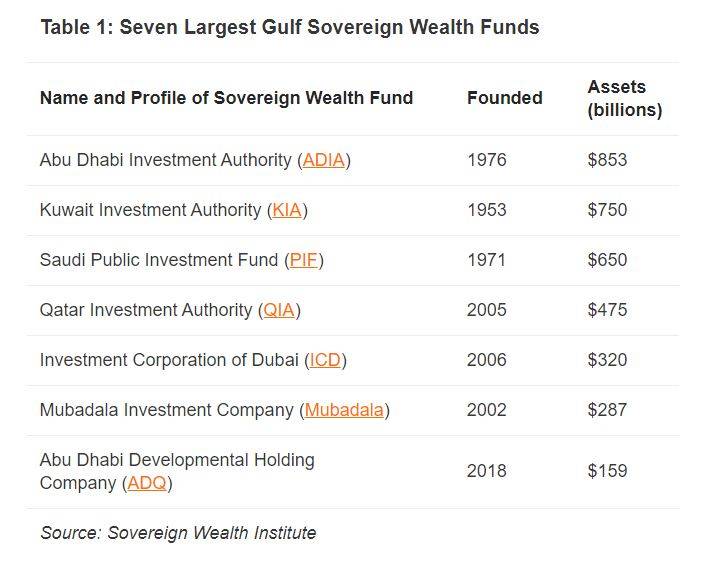 中东海湾地区目前拥有约20个主权财富基金,财力雄厚,共管理着约3.7万亿美元。据主权财富基金研究所(Sovereign Wealth Fund Institute)的数据,该地区最大的七个基金总资产超过3.2万亿美元,约占全球主权财富基金资产的40%,主要来自阿联酋、沙特、卡塔尔和科威特。