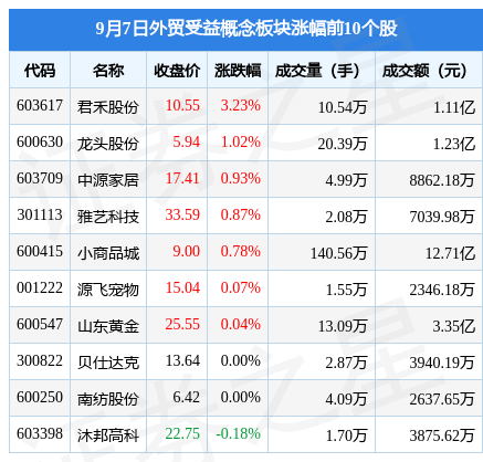 9月7日外贸受益概念板块较上一交易日下跌0.94%,永和智控领跌。当日上证指数报收于3122.35,下跌1.13%。深证成指报收于10321.44,下跌1.84%。外贸受益概念板块个股涨跌见下表: