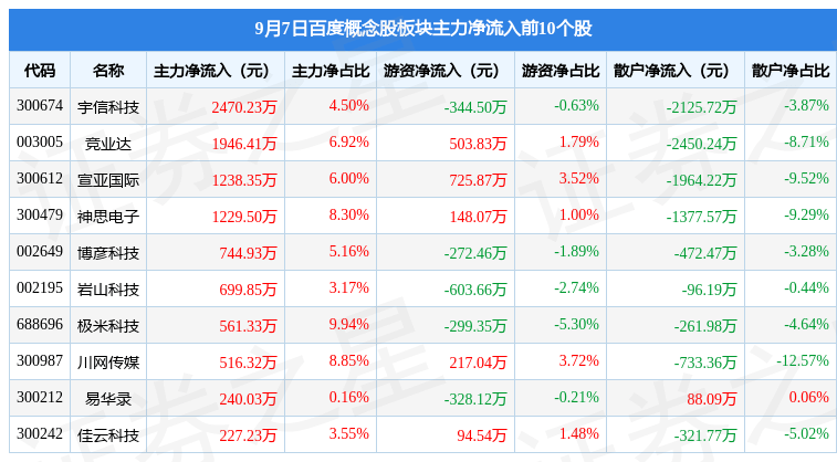 从资金流向上来看,当日百度概念股板块主力资金净流出24.47亿元,游资资金净流入4.89亿元,散户资金净流入19.58亿元。百度概念股板块个股资金流向见下表: