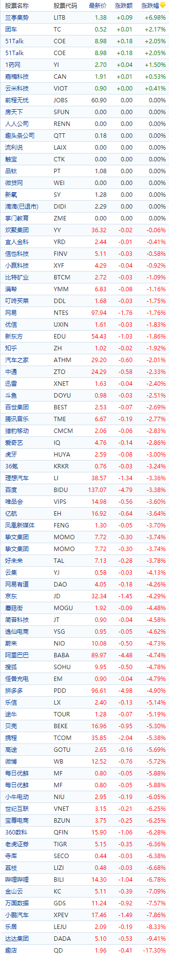 每日优鲜,微博,携程,贝壳,途牛,乐信跌超5%,拼多多、怪兽充电,搜狐,阿里巴巴,蔚来,逸仙电商,简谱科技,蘑菇街,京东,有道,云集跌超4%,好未来,陌陌,亿航,唯品会,百度,理想汽车,36氪跌超3%,虎牙,爱奇艺,猎豹移动,腾讯音乐,百世集团,斗鱼,迅雷,中通快递,汽车之家跌超2%,知乎,新东方,优信,网易,叮咚买菜,满帮,比特矿业跌超1%,小赢科技,新业科技,宜人贷,欢聚小幅下跌。
