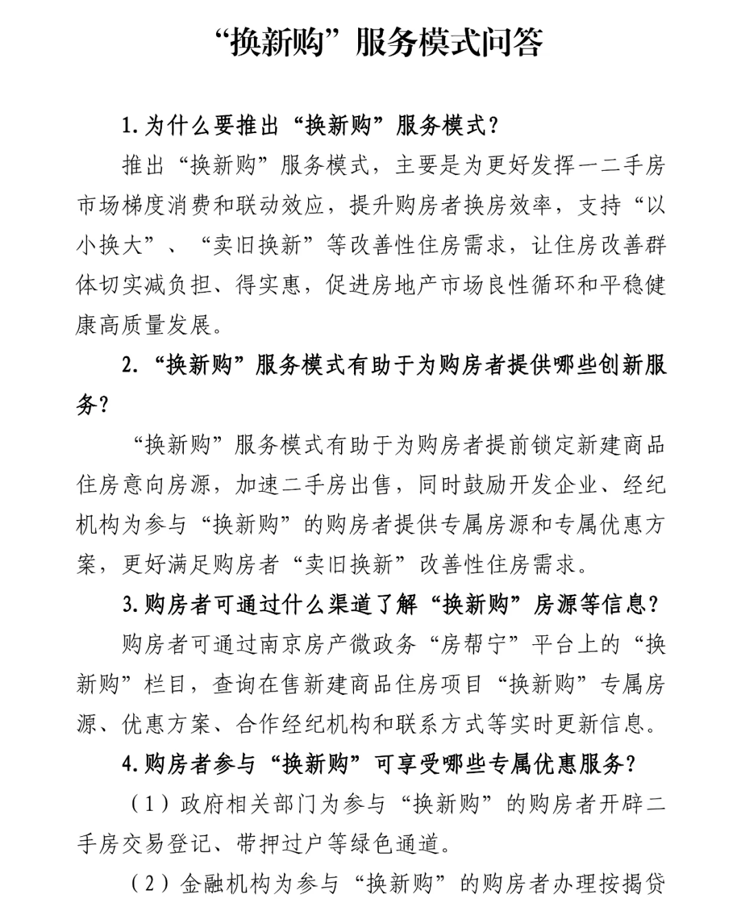 该通知是面向各房地产开发企业、房地产经纪机构发布。《通知》提出,为更好发挥一二手房市场梯度消费和联动效应,支持“以小换大”“卖旧换新”等改善性住房需求,促进房地产市场良性循环和平稳健康高质量发展,南京房地产业协会、南京市房地产经纪行业协会联合推出“换新购”服务新模式。