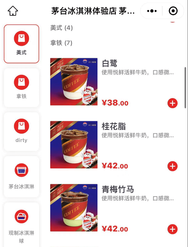 不仅如此,今年6月,在茅台冰淇淋小程序上,广州的茅台冰淇淋旗舰店上线了含有茅台酒的咖啡,美式、拿铁、Dirty三个品类共14款产品,售价从28元到42元不等。尽管茅台官方回应称,这是门店的自发行为,并非公司新推出的跨界产品,但还是能依稀窥见茅台的野心。