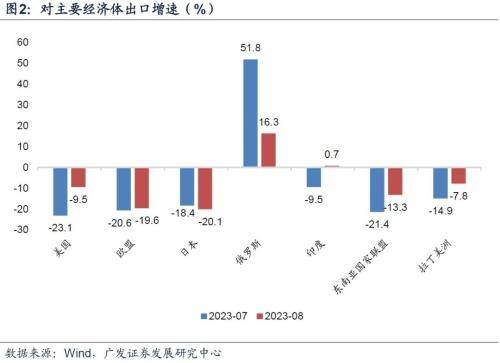 8月对美出口同比为-9.5%,高于前值的-23.1%;对欧出口同比为-19.6%,略高于前值的-20.6%;对日出口同比为-20.1%,低于前值的-18.4%;对中国香港地区出口同比为-2.5%,高于前值的-8.5%;对俄罗斯出口同比为16.3%,低于前值的51.8%;对印度出口同比为0.7%,高于前值的-9.5%。对拉丁美洲出口同比为-7.8%,高于前值的-14.9%。