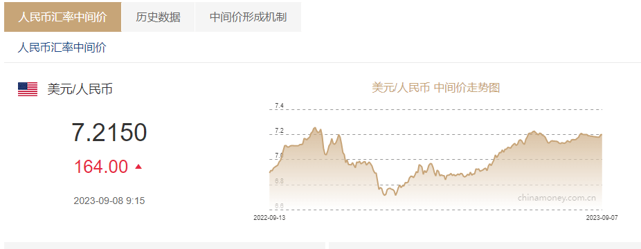 金融界9月8日消息 中国外汇交易中心显示,8日,人民币对美元中间价报7.2150,调贬164个基点。昨日在岸人民币兑美元收盘报7.3279,较上一交易日下跌195点。离岸人民币兑美元北京时间04:59报7.3422元,较周三纽约尾盘跌214点,盘中整体交投于7.3190-7.3459元区间。