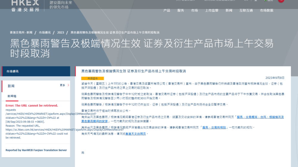 上交所公告,9月8日,香港联合证券交易所因黑色暴雨暂停交易。根据《上海证券交易所沪港通业务实施办法》,沪港通下港股通暂停交易。