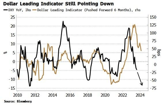 首先,他根据长期利率预期推出的美元中期领先指标仍指向下行。