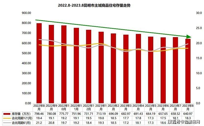 其实从过去一年昆明主城商品住宅库存去化情况看,今年3月到6月,去化周期曾经回落到18个月以内,但随着6月以后新房销量进一步下降,去化周期再度超过18个月,但即便如此,8月底昆明住宅绝对库存和6月份相比仍旧少了17万平方米。