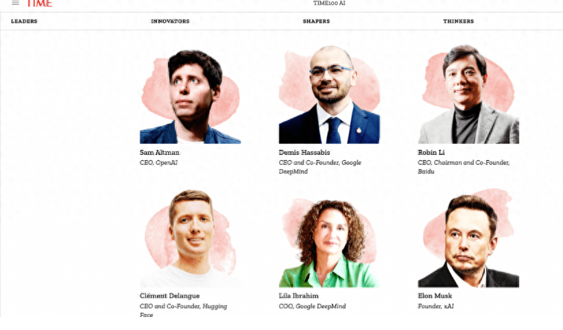 据《时代》刊文,榜单共汇集了人工智能领域的领袖(Leaders), 创新者(Innovators), 影响者(Shapers)和思想家(Thinkers)四类。杂志肯定了100人对AI行业的巨大影响力,《时代》周刊主编在榜单评语中写道,“他们的洞察力、愿望和缺点将决定这一日益有影响力的技术的方向。”