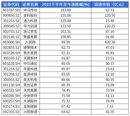 2023下半年以来,市场小盘风格特征显著。Wind数据显示,截至2023年9月7日,2023下半年以来涨幅排名前20的个股(剔除2023年度新股、ST股),平均流通市值仅为72.21亿元。百亿及以下个股占据TOP20逾8成席位。