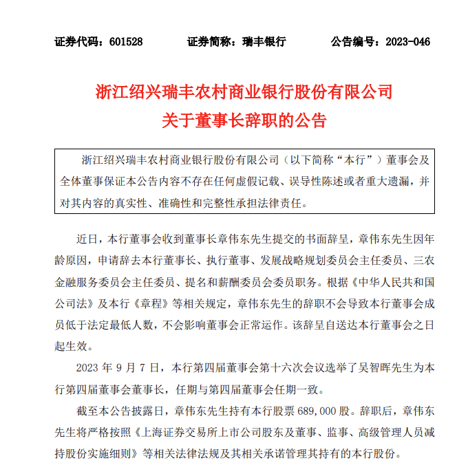 同时,公告还显示,2023年9月7日,瑞丰银行第四届董事会第十六次会议选举了吴智晖为该行第四届董事会董事长,任期与第四届董事会任期一致。