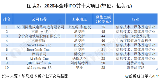 2020年全球最大的IPO项目是中国科创板的中芯国际集成电路制造公司,募集金额达到75亿美元,同时在全球前5大IPO项目中,有四家都是中国企业,其中京东集团的京东物流和京东健康分拆上市。
