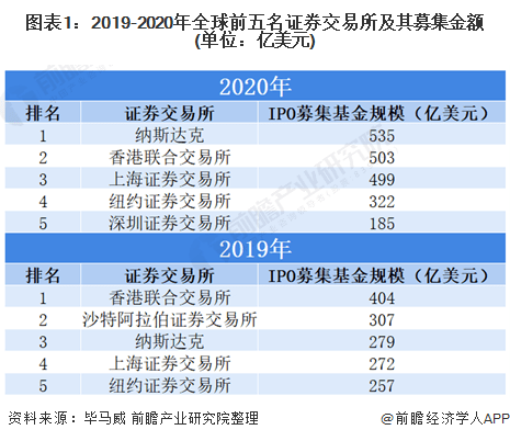 根据毕马威数据,2020年全球IPO募集资金最多的是美国的纳斯达克证券交易所,募集金额达到535亿美元,中国的香港联合交易所、上海证券交易所和深圳证券交易所分别位列第二、第三和第五。从募资金额来看,前五名证券交易所中中国证券交易所共募集金额为1187亿美元,美国证券交易所共募集金额857亿美元。