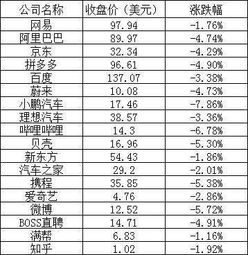 中概电商龙头股中,阿里巴巴下跌4.74%,京东下跌4.29%,拼多多下跌4.90%。