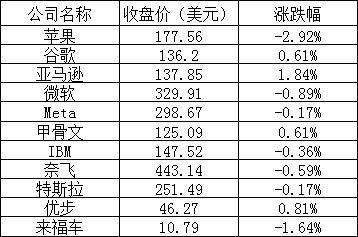 大型科技股多数下跌,苹果跌幅接近3%,两天累计下跌超过6%,市值蒸发1900亿美元(约近1.4万亿人民币);谷歌和亚马逊上涨,亚马逊涨幅超过1%。