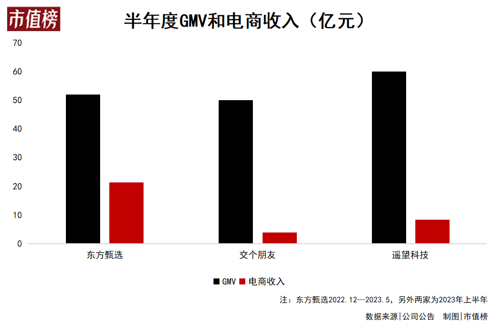 东方甄选收入最高,上半年(2022.12—2023.5)为24.3亿元,主要是因为自营商品卖得多,自营商品的GMV都是收入。
