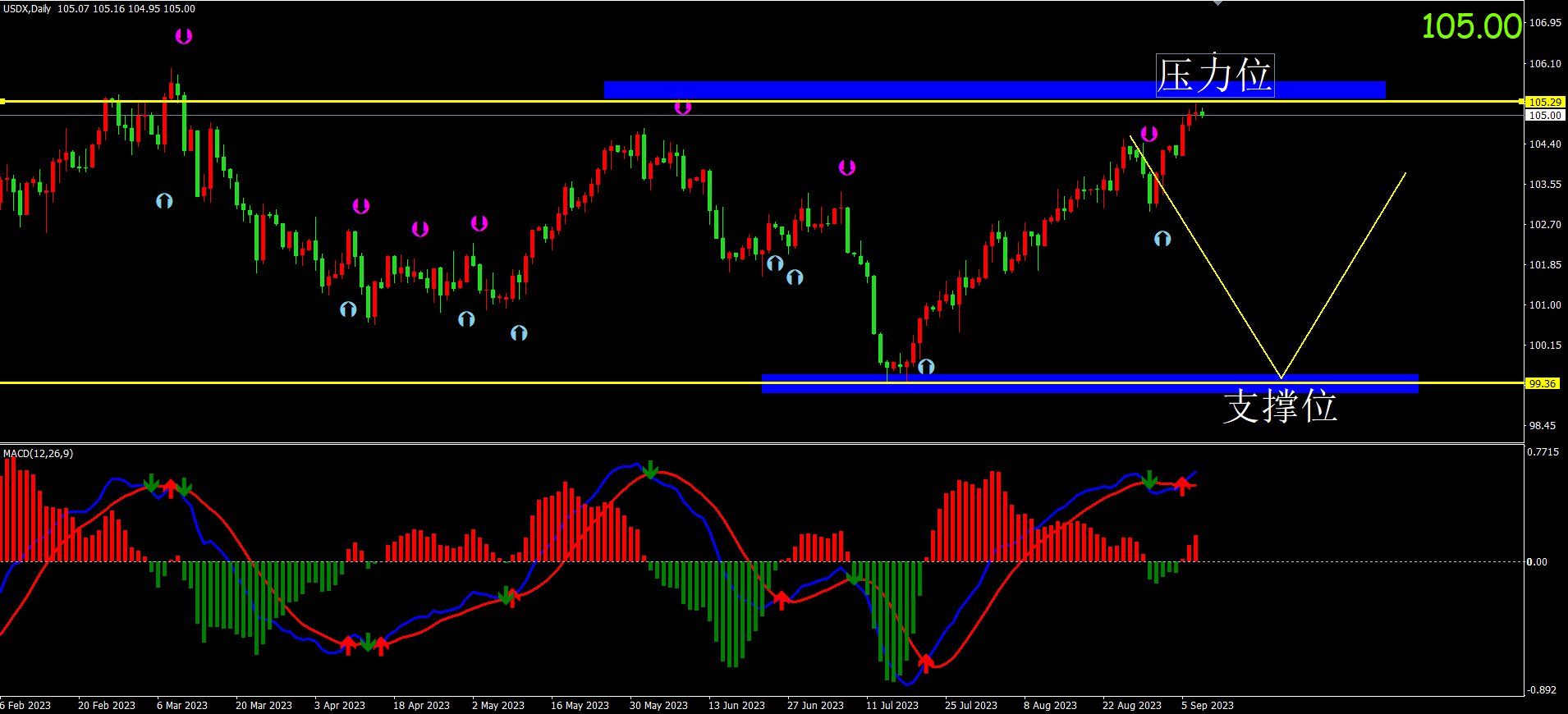 美元指数:图表显示目前美指为震荡反弹行情。关注压力105.00位置。